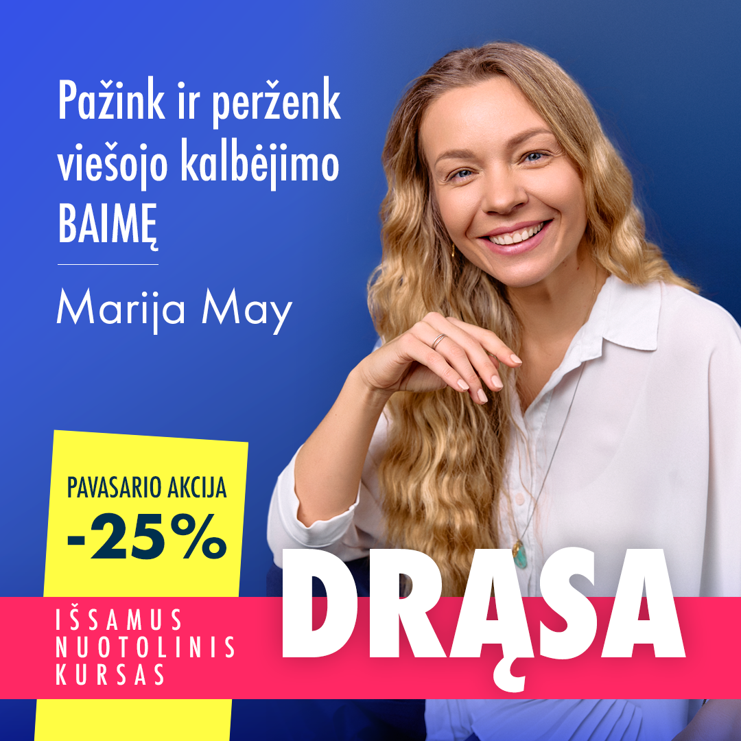 Noriu padėkoti už šį kursą 😊. Jis man padėjo pažvelgti į savo baimę giliau, suvokti, kad kelias į laisvą kalbėjimą yra atrandamas sujungiant kūną, mintis ir emocijas. Tai buvo didelė naujiena.